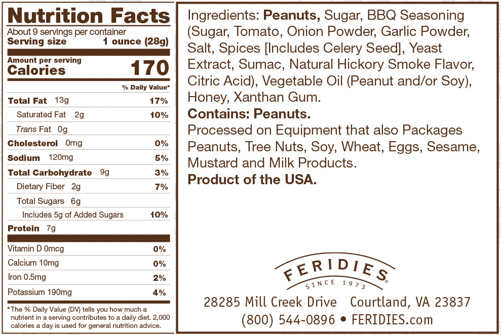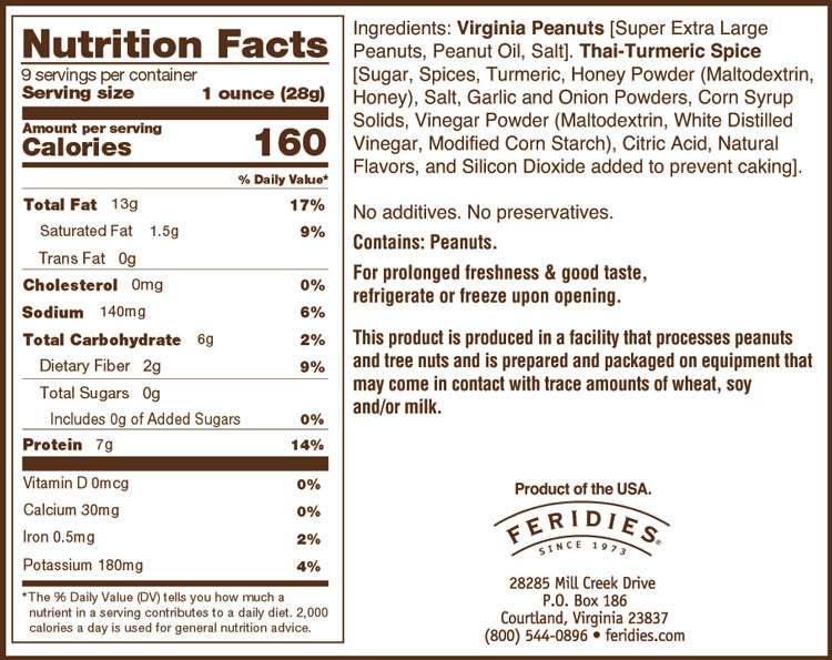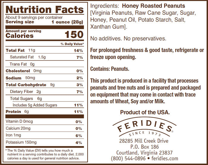 FERIDIES® selects the largest of the Virginia peanut crop, gently roasts them in small batches in pure peanut oil and seasons them to perfection with a variety of spices to tantalize your taste buds. Add a little spice to your life with our seasoned selection of Virginia Peanuts!