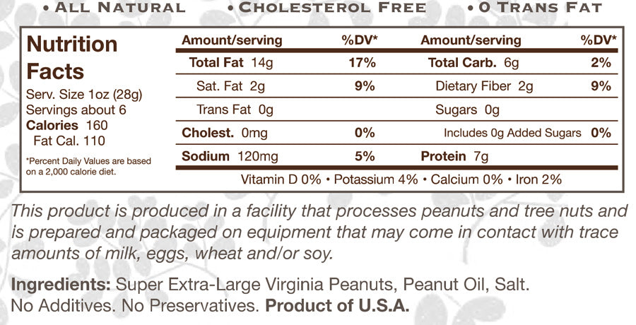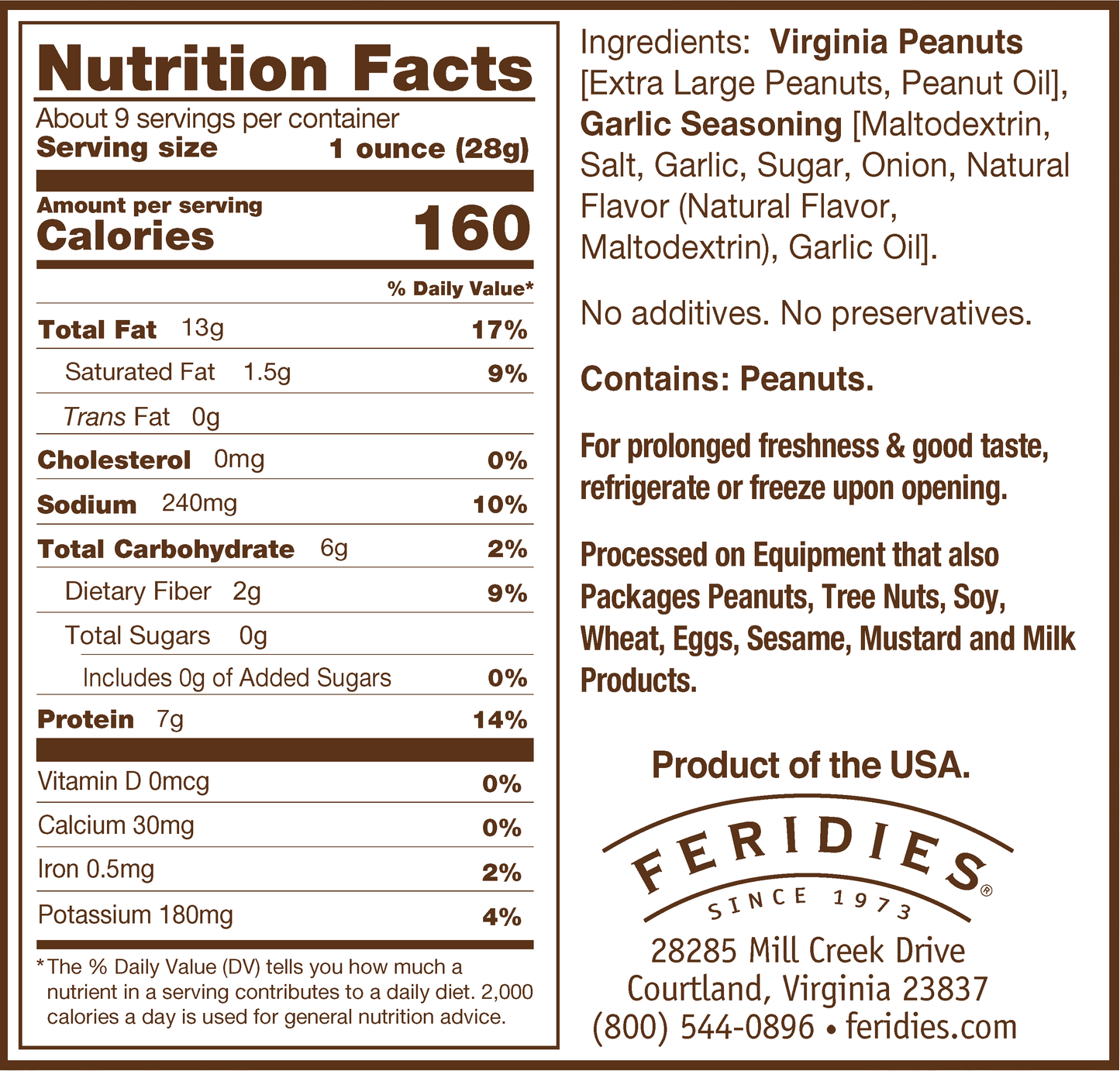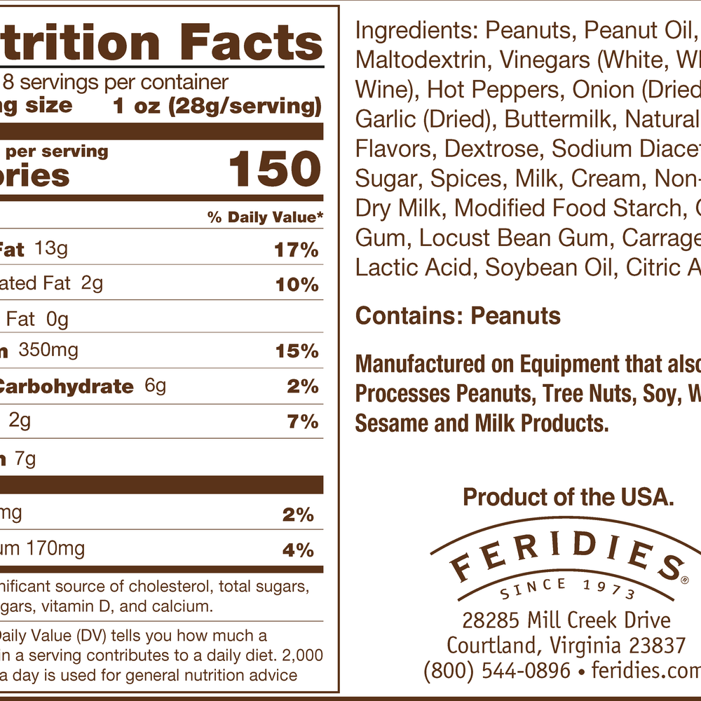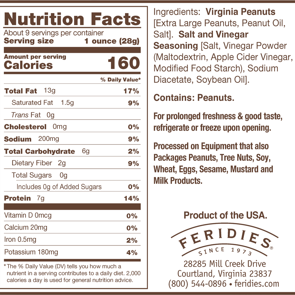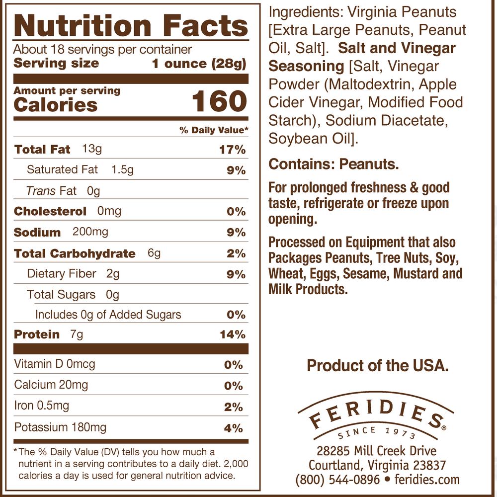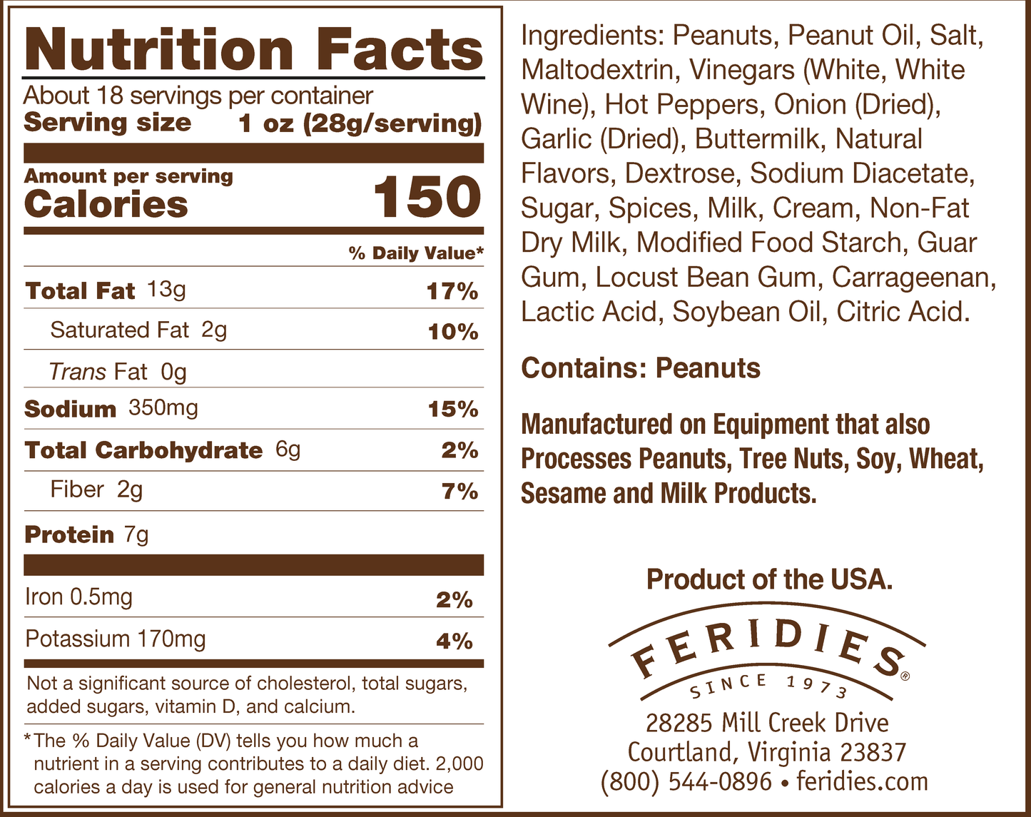 Virginia peanuts are a type of peanut known for their large size, crunchy texture, delicious flavor, and high nutritional value. FERIDIES® only selects the largest 2% of the crop and gently hand-cooks them in peanut oil in small batches to ensure their distinct, rich peanut taste while maintaining the healthy qualities of an all-natural snack.