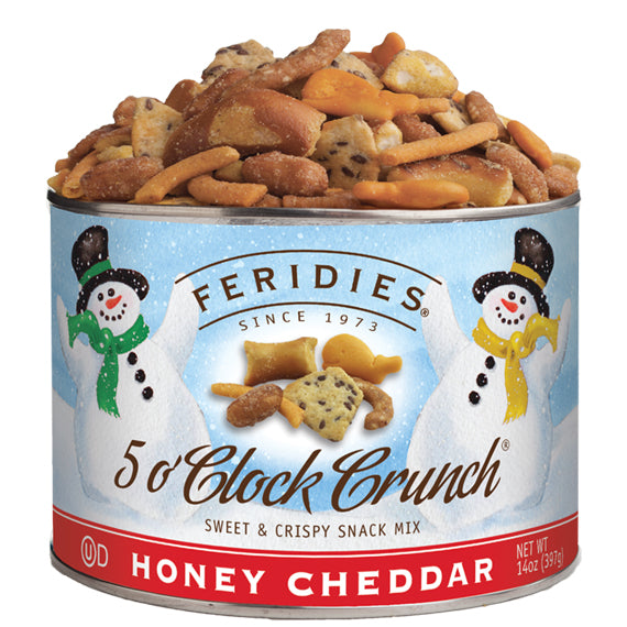 A favorite among our staff and customers, 5 O'clock Crunch® quickly disappears every time it is served. This popular honey cheddar mix includes honey roasted peanuts, cheddar cheese crackers, chili-lemon corn sticks, honey roasted sesame sticks, honey mustard pretzel sticks and salted corn chips with flax seed. Available in snowmen packaging to be enjoyed all winter long! The dimension of the 14 oz. can is 5" x 3.5". Shelf life is approximately 1 year (unopened). OU Dairy Kosher Certified.