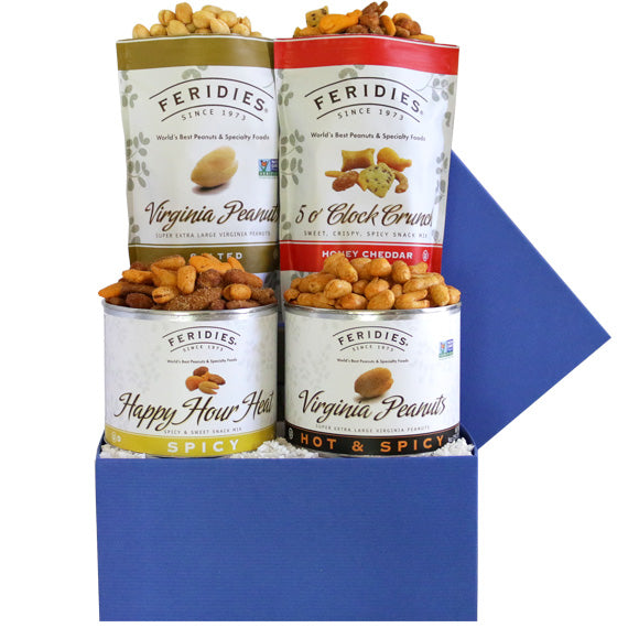 When it's 5 O'Clock somewhere, these are the perfect snacks to compliment your favorite beverage as you relax or celebrate with friends. This savory assortment includes 9 oz. Hot & Spicy Virginia Peanuts, 9 oz. Happy Hour Heat, 6 oz. 5 O'Clock Crunch® and 6 oz. Salted Virginia Peanuts. OU Dairy Kosher Certified.