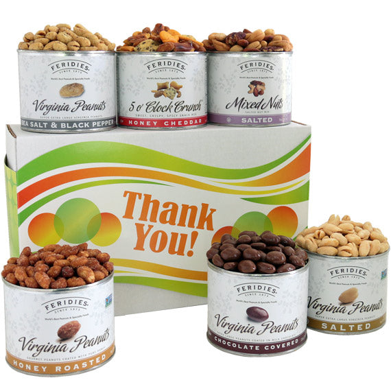We've curated this gift box with a delicious assortment of flavors and crunchy treats to satisfy every craving. Inside, you'll find a variety of our favorites: 9 oz. Salted Virginia Peanuts, 11 oz. Chocolate Covered Virginia Peanuts, 9 oz. Honey Roasted Virginia Peanuts, 6 oz. 5 O'Clock Crunch, 9 oz. Mixed Nuts, and 9 oz. Sea Salt & Black Pepper Peanuts. Perfect for gifting or indulging! All items are packed securely in a white gift box wrapped with a Thank You band. Shelf life is approximately 1 year. OU Dairy Kosher Certified.