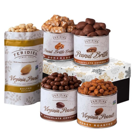 This irresistible combination includes 6 oz. Salted Virginia Peanuts, 11 oz. Milk Chocolate Covered Virginia Peanuts, 9 oz. Chocolate Covered Peanut Brittle, 9 oz. Peanut Brittle Crunch, and 9 oz. Honey Roasted Virginia Peanuts. The colorful gift wrapped box will make a stunning presentation throughout the holidays season. Dimensions are approximately 12" x 7" x 4.5". OU Dairy Kosher Certified.