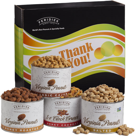 Say THANK YOU with generous portions of these crowd pleasing favorites! The Party Pack includes 18 oz. Salted Virginia Peanuts, 18 oz. Cajun Virginia Peanuts, 14 oz. 5 O'clock Crunch and 18 oz. Honey Roasted Virginia Peanuts. This foursome is guaranteed to be a hit, unless you decide to keep them for yourself! All items are packed securely in a black gift box with a colorful and fun Thank You gift band. Shelf life is approximately 12 months. OU Dairy Kosher Certified.