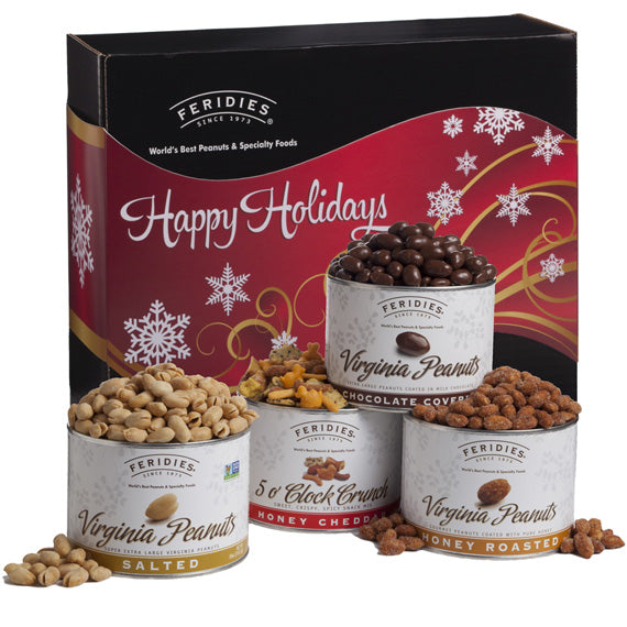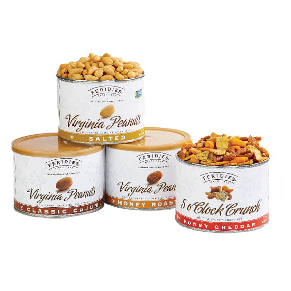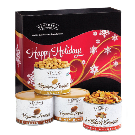 Kick start your party by serving generous portions of these crowd pleasing favorites! The Party Pack includes 18 oz. Salted Virginia Peanuts, 18 oz. Cajun Virginia Peanuts, 14 oz. 5 O'clock Crunch and 18 oz. Honey Roasted Virginia Peanuts. This foursome is guaranteed to be the hit of the party, unless you decide to keep them for yourself! All 4 cans are packed securely in a black gift box. Also available with themed gift bands: Happy Birthday, Happy Holidays, Thinking of You and Thank You.