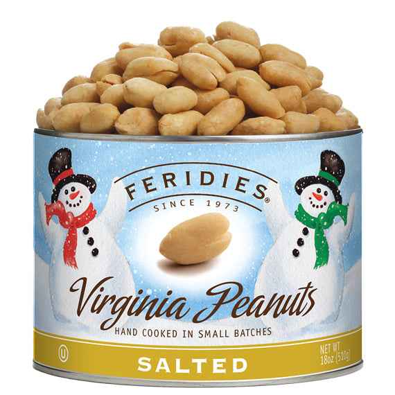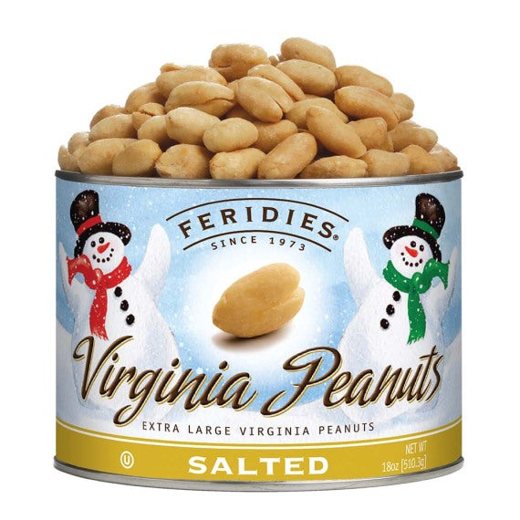 Our best selling extra-large Salted Virginia Peanuts deliver that award-winning taste in every roasted, lightly salted bite of pure peanut flavor. The whimsical label with snowmen will be thoroughly enjoyed throughout the holiday season and winter. The shelf life is approximately 1 year. OU Kosher Certified and Non-GMO Project Verified. The dimension of the 18 oz. can is 5" x 3.5".