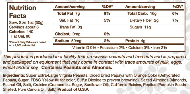 This fruit and nut mix includes extra-large Virginia peanuts, sweet almonds, crunchy pepitas, succulent raisins, sweet dried cranberries and bright fruity papaya. The 6oz bag is re-sealable and has a tear notch making it easy to open and close. OU Kosher Certified.