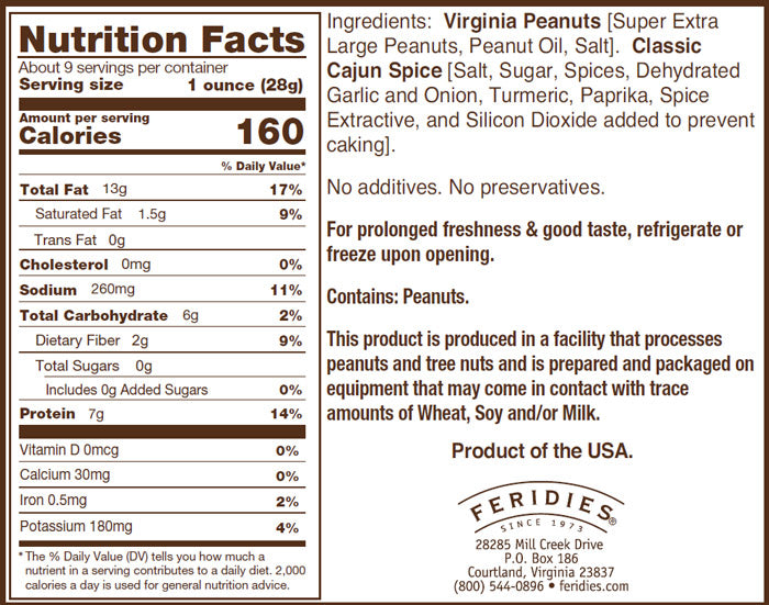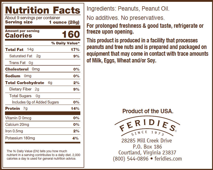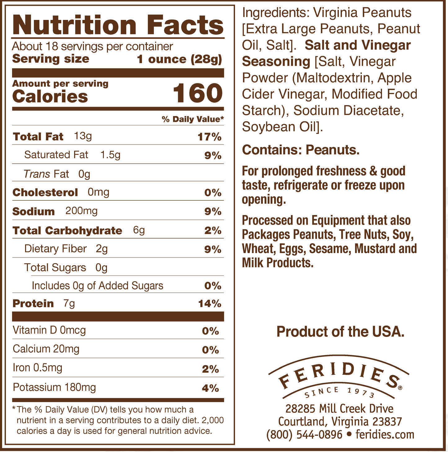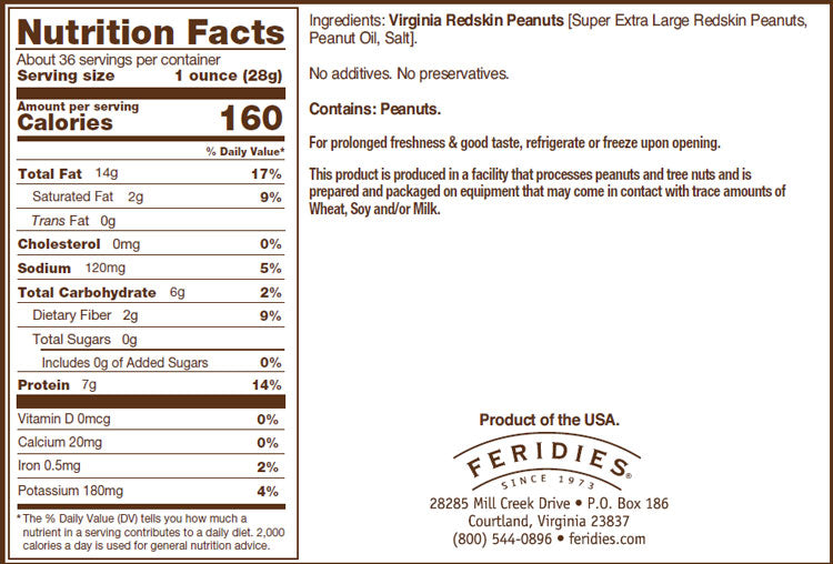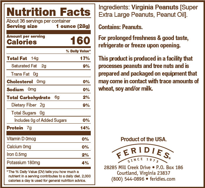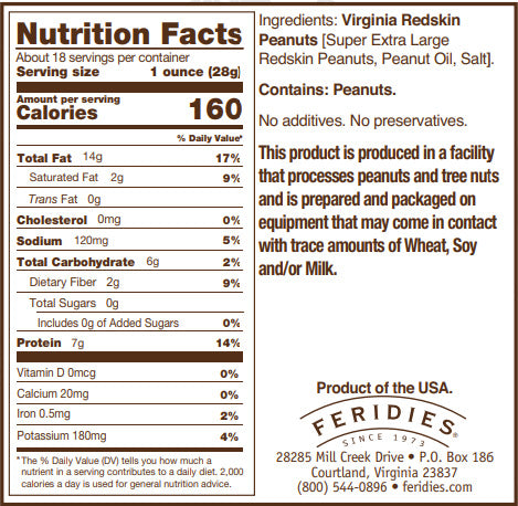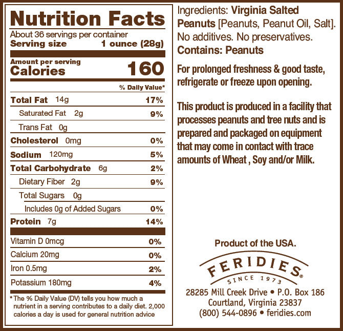 Virginia peanuts are a type of peanut known for their large size, crunchy texture, delicious flavor, and high nutritional value. FERIDIES® only selects the largest 2% of the crop and gently hand-cooks them in peanut oil in small batches to ensure their distinct, rich peanut taste while maintaining the healthy qualities of an all-natural snack.