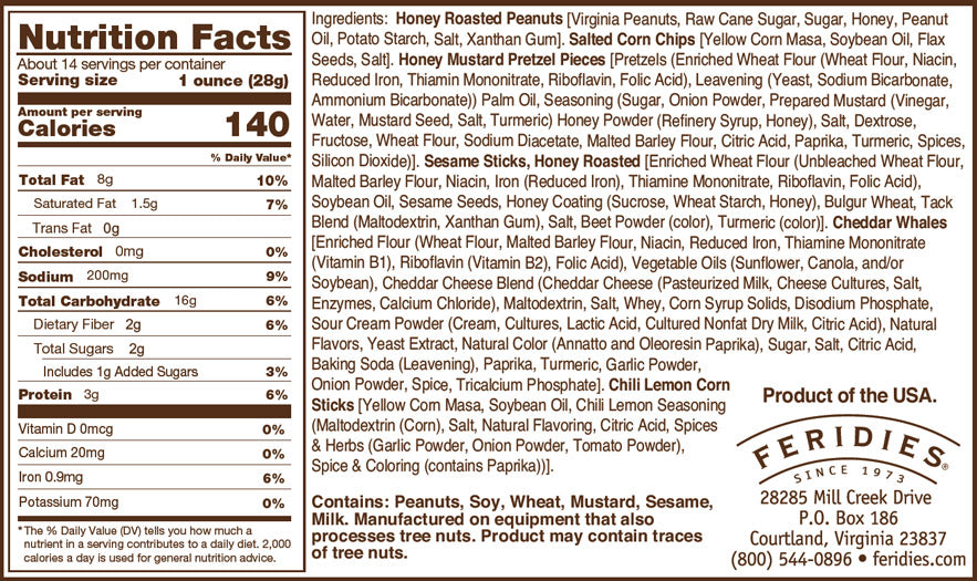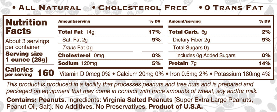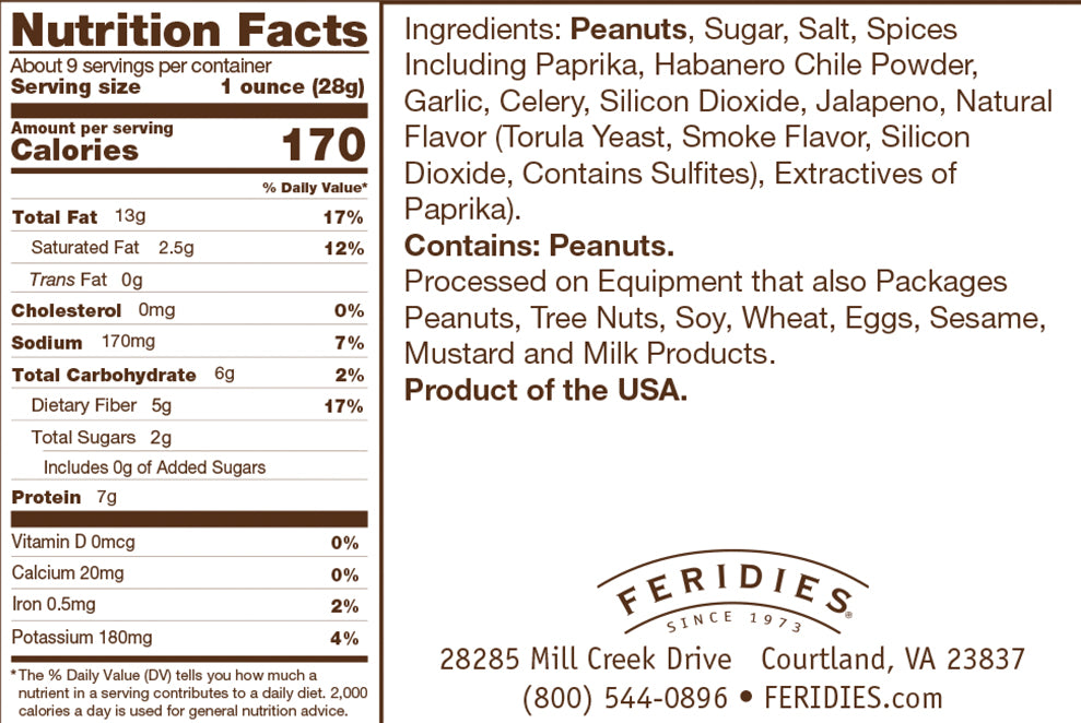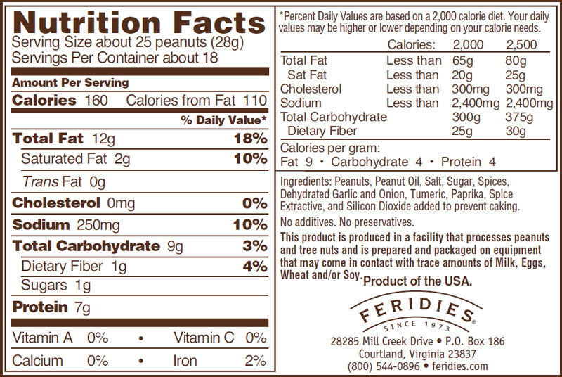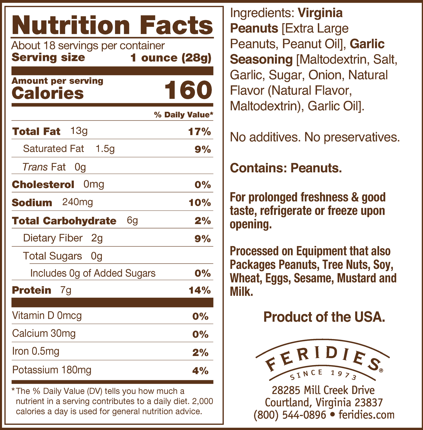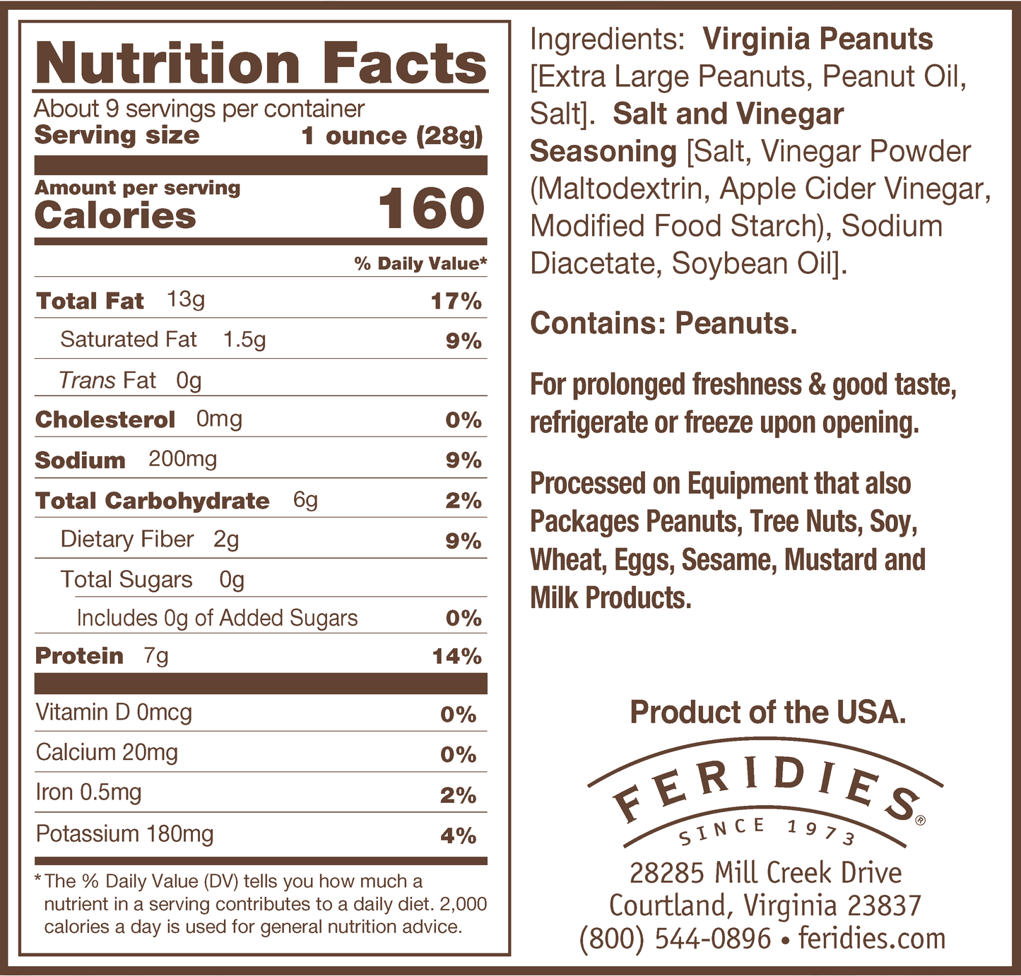 Virginia peanuts are a type of peanut known for their large size, crunchy texture, delicious flavor, and high nutritional value. FERIDIES® only selects the largest 2% of the crop and gently hand-cooks them in peanut oil in small batches to ensure their distinct, rich peanut taste while maintaining the healthy qualities of an all-natural snack.