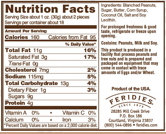 These select peanuts are embedded in a smooth, rich, buttery candy. A little crunchy, a little sweet and a whole lot of DELICIOUS! OU Dairy Kosher Certified. Since these treats are homemade, the color of each batch may be slightly different. Save with the 4 Pack versus single can purchases.